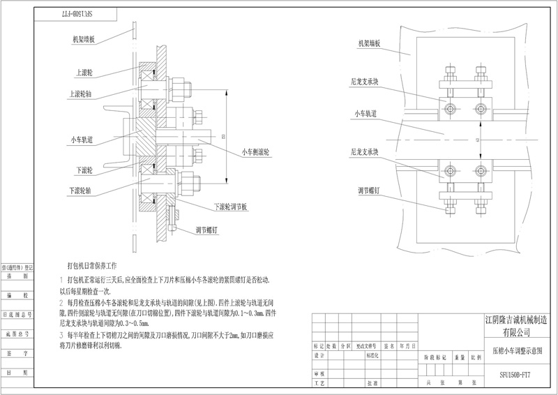 壓棉小車上有滾輪機(jī)構(gòu),當(dāng)壓棉小車運(yùn)行時,滾輪始終在導(dǎo)軌上滾動,運(yùn)行阻力小,左右下滾輪可調(diào)節(jié)。小車裝有下刀片,上下刀片之間的間隙大于2毫米。