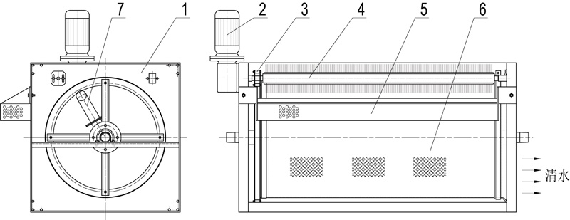 LF model back purge water filter consists of engine frame, rotary screen, back purge water pipe, collecting tank and transmission shifting mechanism etc. Transmission shifting mechanism is realized by nylon pin wheel driving. Impure water runs through filtering screen, and impurities are filtered onto screen surface. Then dirty screen turns towards back purge water pipe, which is applied to wash away impurities. The impurities are removed into collecting tank by brush. Collecting tank needs to be cleaned regularly to ensure normal use. Filtered water runs out of screen filter cylinder and will be pumped away for further use.